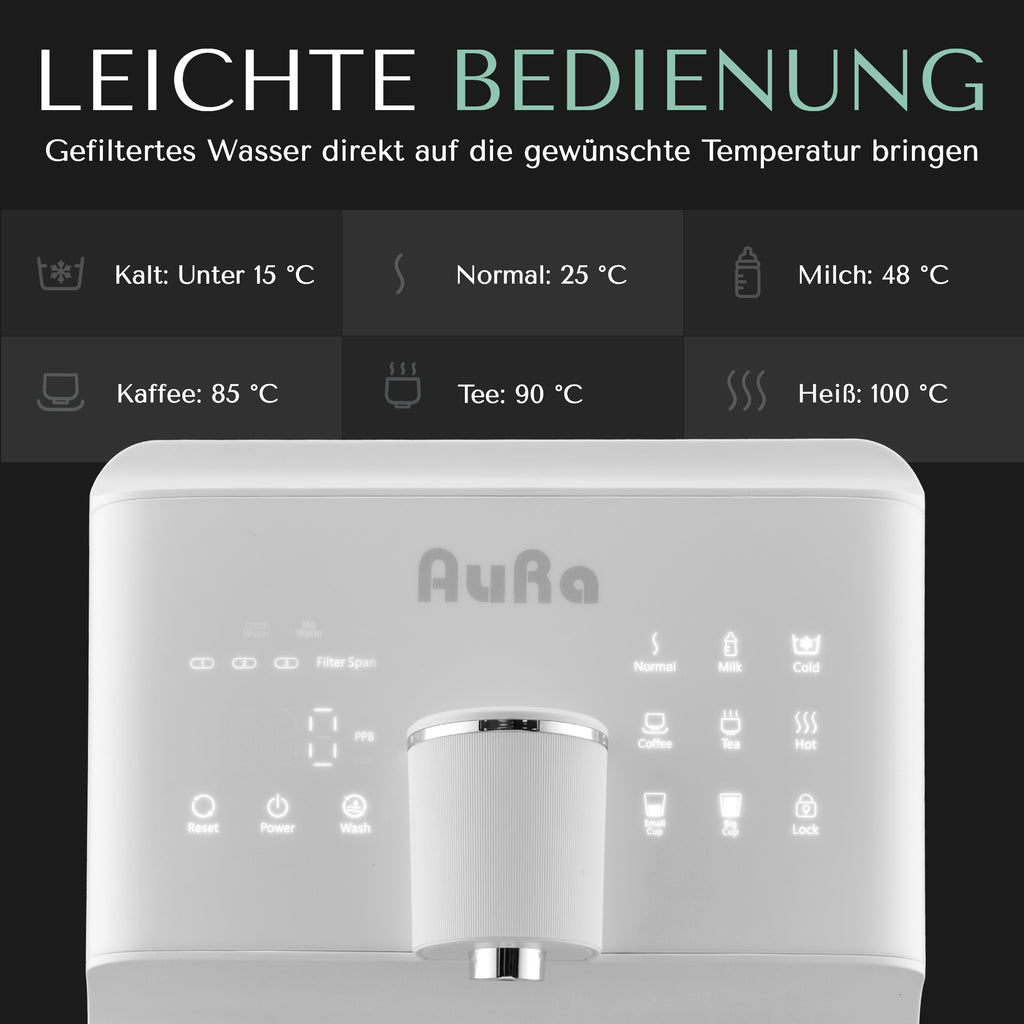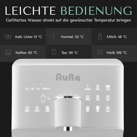 1. gefiltert, 10 °C kalt 2. gefiltert, raumtemperiert 3. gefiltert, 45 °C heiß – perfekt für Milchpulver (Babymilch) 4. gefiltert, 80 °C heiß – perfekt für Tee 5. gefiltert, 90 ° C heiß – perfekt für Kaffee 6. gefiltert, 100 °C heiß