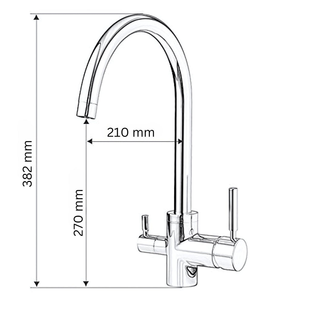 GIULIA 3-Wege-Wasserhahn aus Chrom liefert neben ungefiltertem heißen und kalten Wasser auch gefiltertes Wasser. Das gefilterte Wasser fließt dabei innerhalb der Armatur durch eine eigene Leitung und wird mit einem separaten Bedienhebel geregelt. Die für den Filtervorgang notwendige Technik wird platzsparend unter dem Spülbecken installiert.